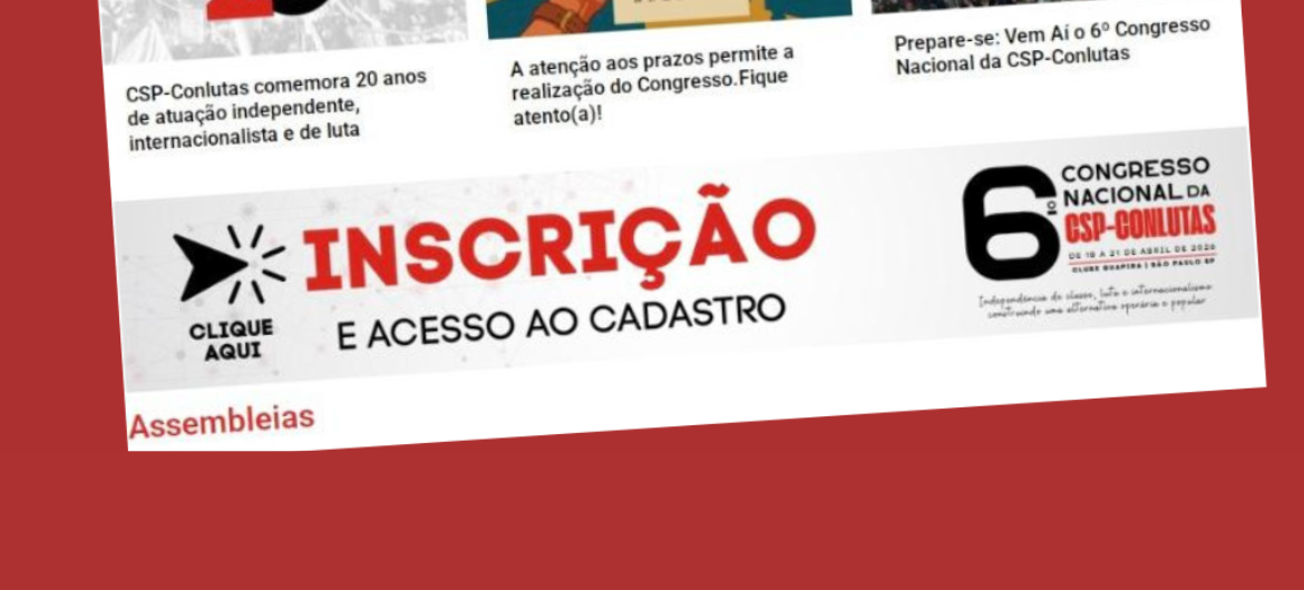 Já está aberto o período de pré-congresso do 6º Congresso Nacional da CSP-Conlutas, principal instância de decisão da Central, que será realizado de 18 a 21 de abril de 2026, em São Paulo, no Clube Guapira, mesmo local do evento anterior. Para acessar todas as informações necessárias para o roganizar o congresso pela base, cumprindo todos os requisitos necessários, você poderá acessar o site do 6º Congresso. Lá estarão as informações sobre prazos, regimento, estatuto, realização de assembleias, regularização financeira e credenciamento.